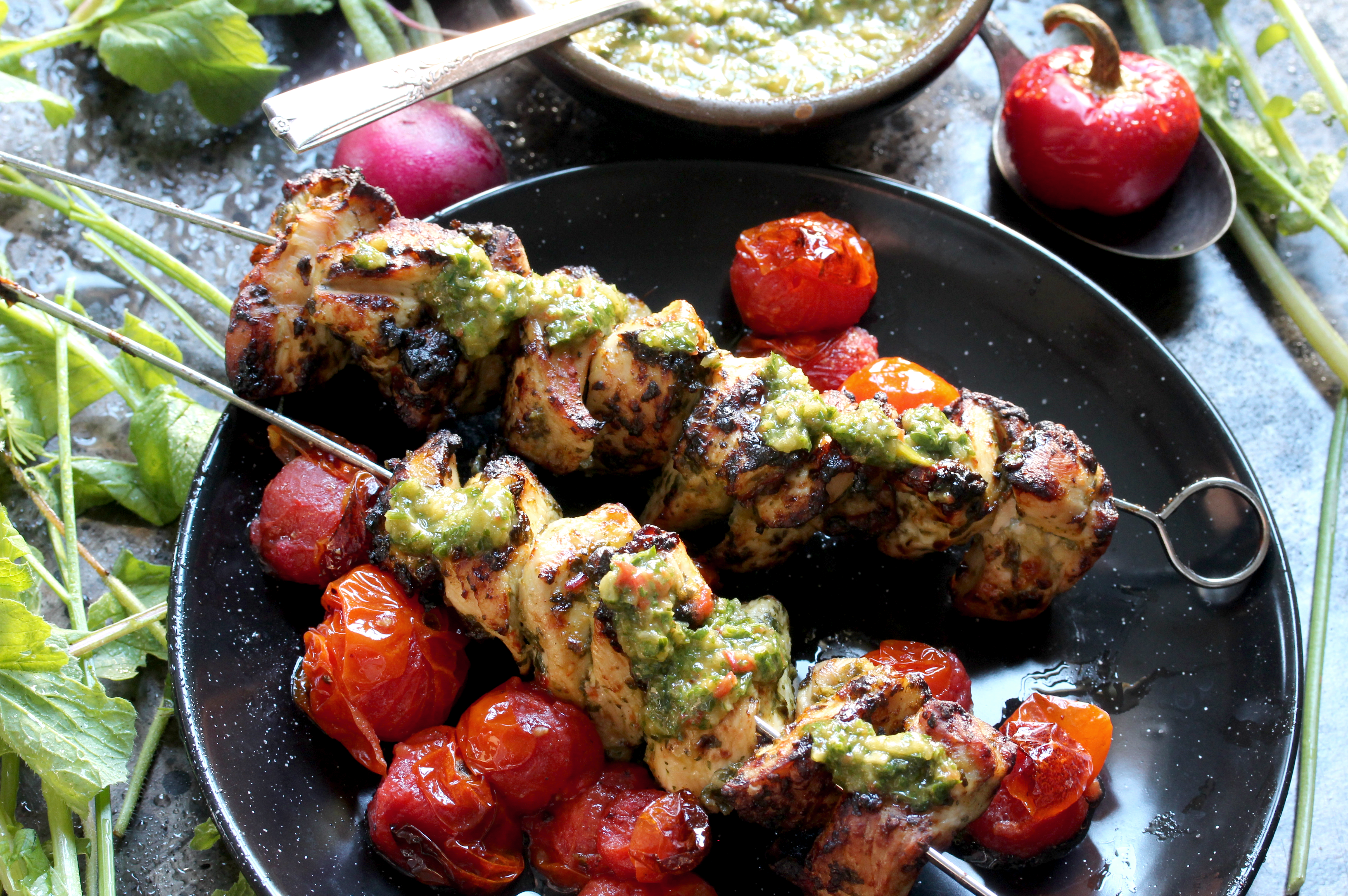 - Serve chicken with tomatoes and extra chimichurri for dipping.