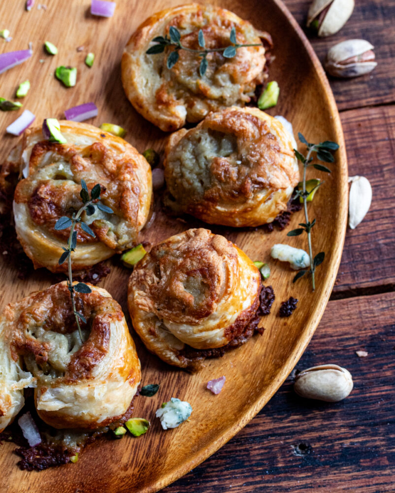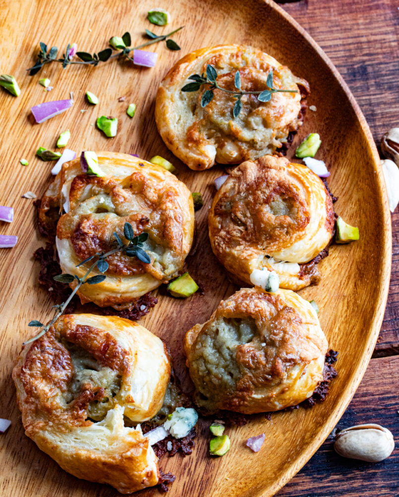 So, whether you’re hosting friends or just indulging yourself while watching a movie, these cheddar and blue cheese puff pastry roll ups deliver irresistible flavor in every bite.