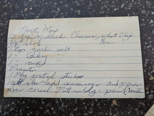 Oh, happy night! When my Aunt Barb and Uncle Ed would come with my cousin for the festivities, Jan and I would plop on the floor in front of the tree and pop open a tin. And even with the warning that we’d “ruin our dinner,” we really didn’t care. It was Grammy’s Chex Mix!
