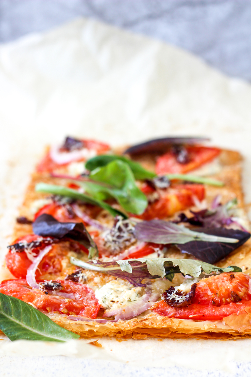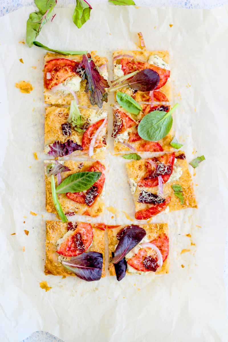 And by the time your little project is over, you always have something beautiful to show for it. In this case, it’s parmesan cheese deliciousness between layers of phyllo, topped with tomatoes, bacon and more cheese.