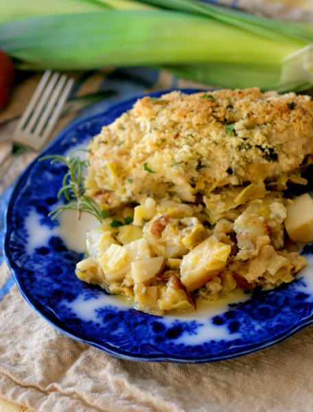 Do you have two chicken breasts? A couple of potatoes and a leek? Hello, delicious gratin! I’m madly in love with this dish, because even though there aren’t a lot of ingredients – it packs a wallop of flavor.